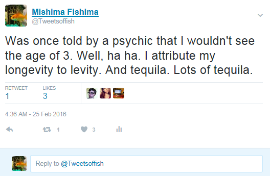 I love fish. Not so much to eat—if given a choice, I’d much rather have steak—but as far as living organisms go, I’ve got a tremendous fondness for the wee, finned ones. We have 2 ponds on our property, both stocked with goldfish, and until recently, we had a pond at our cottage, also inhabited by over a dozen swimmers of all colour variations. And then, of course, there’s Mishima, who lives in a tank on the kitchen island. He’s a narcissistic diva, but over the last 4 years, we’ve come to an understanding. He doesn’t trash me on his Twitter feed (@tweetsoffish), and I feed him. It’s a deal that benefits him more than me, to be honest, because while he can be rather cutting, he is still just a fish, and his opinion of me is just about as compelling as Donald Trump congratulating Scotland on Brexit. Scotland responded exactly the way I do with Mishima, which is to roll my eyes and call him a “mangled apricot hellbeast” But Mishima doesn’t realize just how lucky he is, considering my actual track record of keeping fish alive…