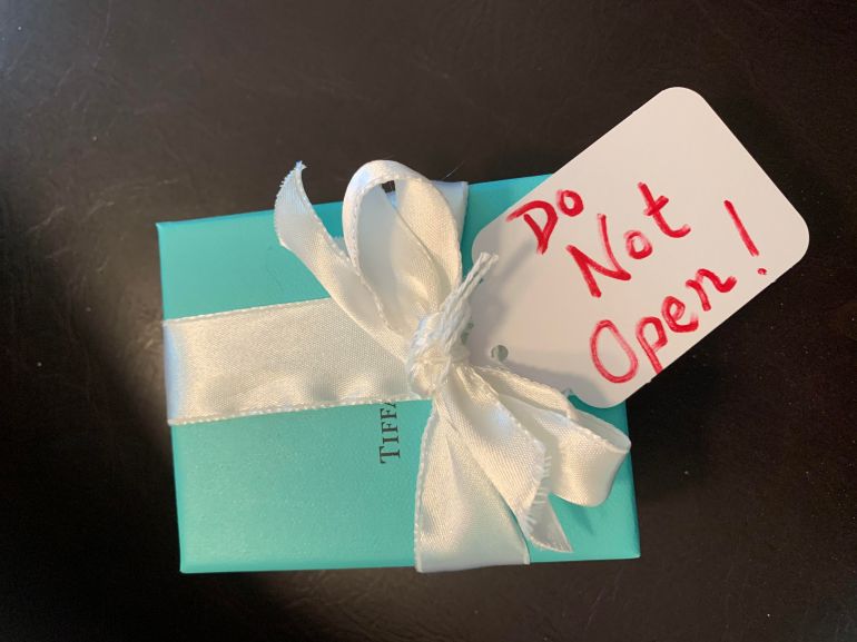 So there the box sits, like a small rectangular elephant, in the middle of the room, surrounded by dozens of other boxes that I’m ALLOWED to open if I wanted to, but I don’t want to—I only want to open the one I’m not allowed to. Did I secretly open it after she left? Absolutely not. I respect her privacy. Also, duct tape is notoriously difficult to peel off cardboard without damaging it, so she’d obviously notice if I tried. Which I haven’t. But I WILL have my revenge. I found this empty box and I’m just going to leave it in random places around the house:
