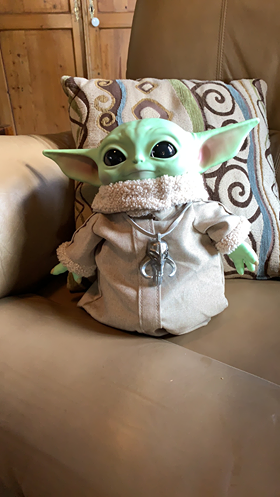 Of course, having the perfect comfy chair didn’t really help the viewing itself, particularly when it came out finally that The Child, who is apparently NOT Baby Yoda, is actually called Grogu. What kind of name is that for an adorable animated puppet? I recently bought Kate a toy Baby Yoda, and I call it Shmoo, which I think is much better and cuter. But at least I got to watch the whole thing in a warm room, glass of wine in hand, and completely horizontal.