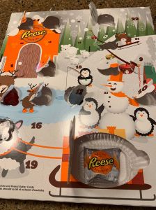And you’d think that SOMEONE in my house would be like, ‘Oh poor you—here, let me buy you an Advent calendar of your own so that you can join in the fun’ but alas, that did not happen. What did happen is that, hopes dashed, I went out at the last minute to get one for my own damn self, but all they had left were Reese’s Peanut Butter calendars. At first read, I’m sure you’re thinking, ‘Why, that’s not so bad’ but let me assure you that after last year’s Reese’s fiasco, I was none too pleased. Let me explain: