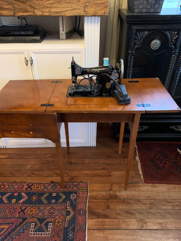 Now that the squares are hypothetically cut, I have to sew them together. Normally, I just use a staple gun when I work with fabric—in fact, I recovered all of our breakfast room chairs a couple of weeks ago and all I needed was a pair of scissors and a staple gun. At first, I figured I could just hand-sew the squares, like the way I sewed up a rip in Kate’s leggings the other day. But when I considered the sad state of my sewing basket (it’s actually a Quality Street tin with a hotel sewing kit in it) and the time it took me to thread the needle, let alone the ten minutes to stitch up a 1 inch rip, I decided against that. So I needed to buy a sewing machine. And wow, those f*ckers are expensive! Luckily, I was on Facebook Marketplace and saw an ad for an old Singer that some woman was selling for thirty-five bucks, which seemed like a good deal. And in the ad, to prove it worked, she was demonstrating sewing a piece of denim! Talk about kismet.