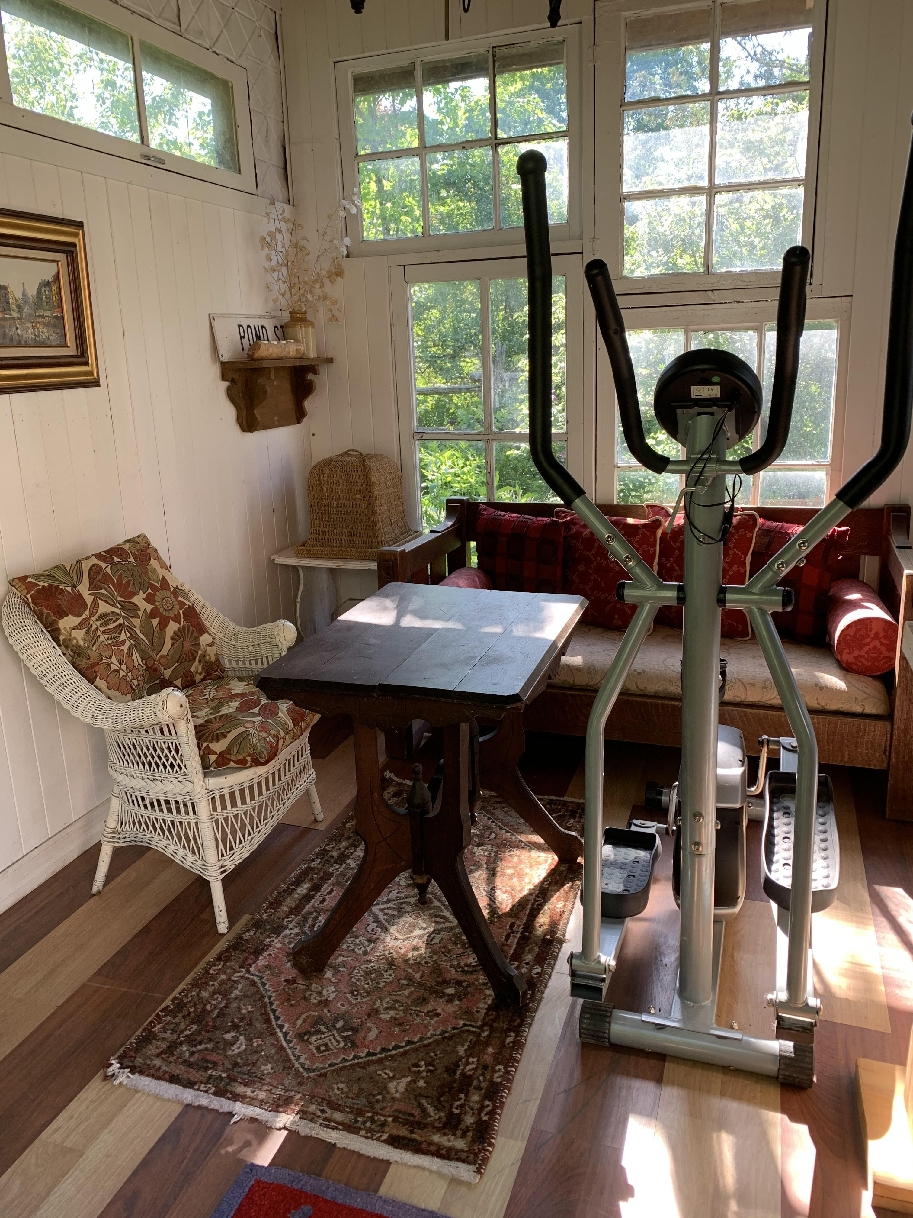 I spent a lot of time last week cleaning out our garden house, which is what we call a cute little structure that Ken built many years ago in our side yard. In the summer, it’s a nice place to sit and relax, and in the winter, it stores all of our summer furniture. So with the weather getting nicer, I decided it was time to take everything out of storage and get the place spruced up. There was only one problem—earlier in the spring, in a sudden moment of lunacy, I had purchased a used elliptical machine from our neighbours across the street who had posted it on Facebook. “Look!” I said to Ken. “It’s not very expensive, we just have to wheel it over here, and it fits in perfectly with my exercise plan.” Ken gave me the look he always gives me when I announce that I’m going to exercise, which is to say, he looked at me with incredulous disbelief.