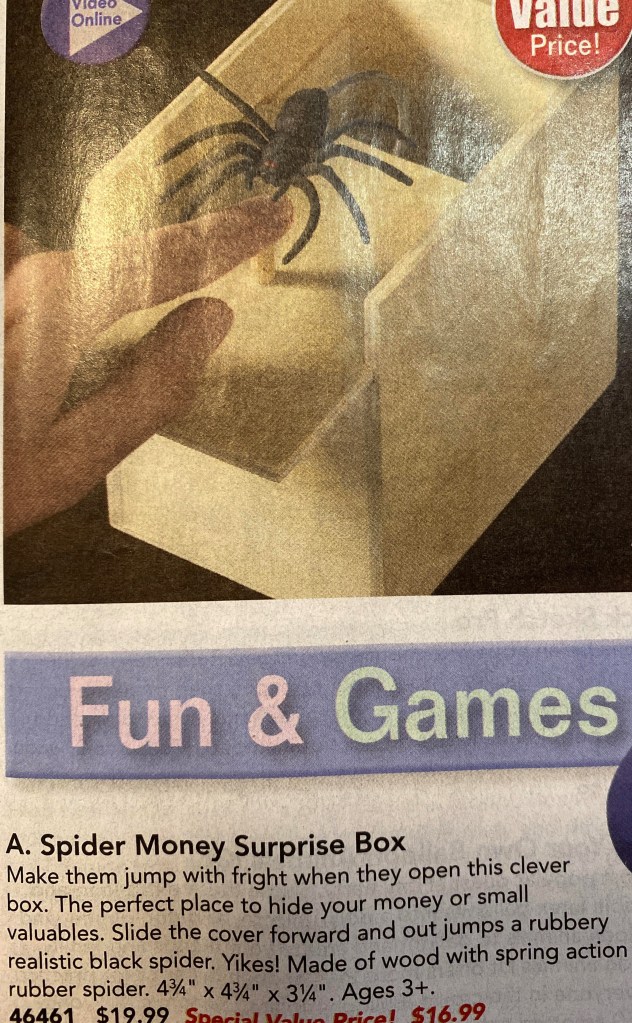 This particular gift is listed under ‘Fun And Games For Kids’ and is described as ‘the perfect place to hide your money or small valuables’. Do you hate your kids? Then surprise them with a terrifyingly large spider when they try to steal from you. Yikes!