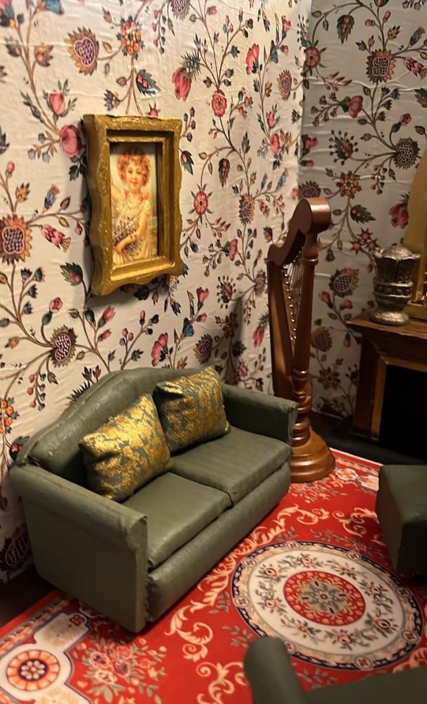 And then, because I was in A MOOD, I decided to tackle my new miniature room, and for the record, let me just clarify that it’s a miniature room, NOT A DOLL HOUSE because that’s a road that, as much as I’d love to go down, is also a rabbit hole that I may never emerge from. But last week, before we went to that awards banquet, I made Ken stop at an antique market up north because I had seen a Facebook post from one of their vendors who specializes in miniatures. Not only him, as it turns out—this place is the MECCA for tiny things and I was super-excited by what I bought, I mean, I got a cute little HARP among other things. I’d been thinking about it all for several days and rearranging things on the counter and looking for ephemera and whatnot, so after our secret library door success, Ken built me a box and I started the room. It turned out even better than I’d hoped and I’m so happy with it. Ken took a look when I was finished though: