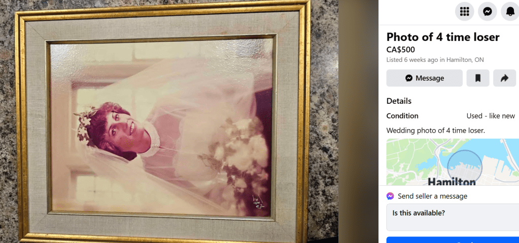It’s been a while since I shared some fun Facebook Marketplace ads with you, so given that not much has happened this week, aside from me taking on teaching a workshop series on writing short stories, getting ready to job shadow at the radio station, scoring the motherlode of designer bags to sell at the market, hitting 20 000 words on my new manuscript, and preparing to publish a fantasy novel Ghost Bride of Gum San by JF Garrard, a terrific Toronto writer, as well as the brilliant new poetry collection Smatterings of Cerulean by the amazing Susan Richardson of the A Thousand Shades Of Green literary podcast and Stories From The Edge Of Blindness blog—well, it’s actually been a busy week but none of that was funny enough to write about so here we go: