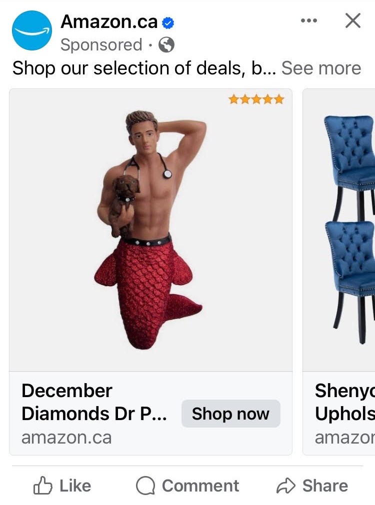 Well, it looks like an inflatable merman. A merman wearing a stethoscope and carrying a puppy, so a…veterinarian merman? Who treats land animals? Below, where it’s cut off, it says December Diamond Dr. P, which I assume is either a very cool rap name, or Dr. P is short for Dr. Perplexed. Which is what I am, and also the good doctor, because the way he’s holding the back of his head makes him look VERY confused about who he is and what he’s doing out of the water. (Also, how does he get to the vet clinic? Does he drag himself down the street or do people bring animals to his…pool?)