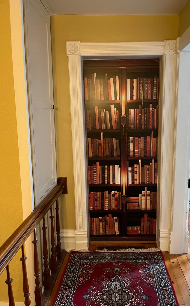 You may remember that Ken and I recently turned part of our house into a space for a Writer’s Retreat and it turned out beautifully. But the one thing I really wanted, the secret library door, had proven to be logistically not possible. The weight of the books alone would make the door possibly pull off its hinges, and other options, like buying books and cutting them down so only the spines were attached was financially not feasible. But then I was on Amazon and saw this amazing wallpaper/sticker type deal that looked like books on a shelf and was long enough that it could be simply stuck to the door, giving the illusion of a bookshelf that would hide the entrance to the library/writing room. I ordered it and it arrived last week. It was in a long tube, so I unrolled it. You may be shocked to learn that it wasn’t quite what I expected.