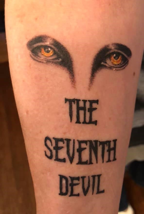 I rolled up my sleeve and turned my head, and when the needle went in it really hurt. I looked back and the tech had a perturbed look on his face, and then I remembered that he was taking blood from my right forearm, you know, the one with the words THE SEVENTH DEVIL splashed across it underneath devil eyes.