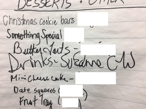 3) I will stop being so bad at potlucks. We used to have potlucks at work all the time, and now that I’m retired, I still attend them occasionally. When I was living in Toronto, I didn’t have a lot of fancy cooking equipment and whatnot, so whenever there was a sign-up, I just put “Drinks”. And while you might think that would make me popular, I learned my lesson after the liquor-filled chocolate meeting snack fiasco of 2017, and when I say drinks, I now mean 2 cases of Perrier, which is terribly boring and probably a let-down for everyone who saw HOW I had signed up for this particular workplace potluck in what appeared to be a very boozy way: